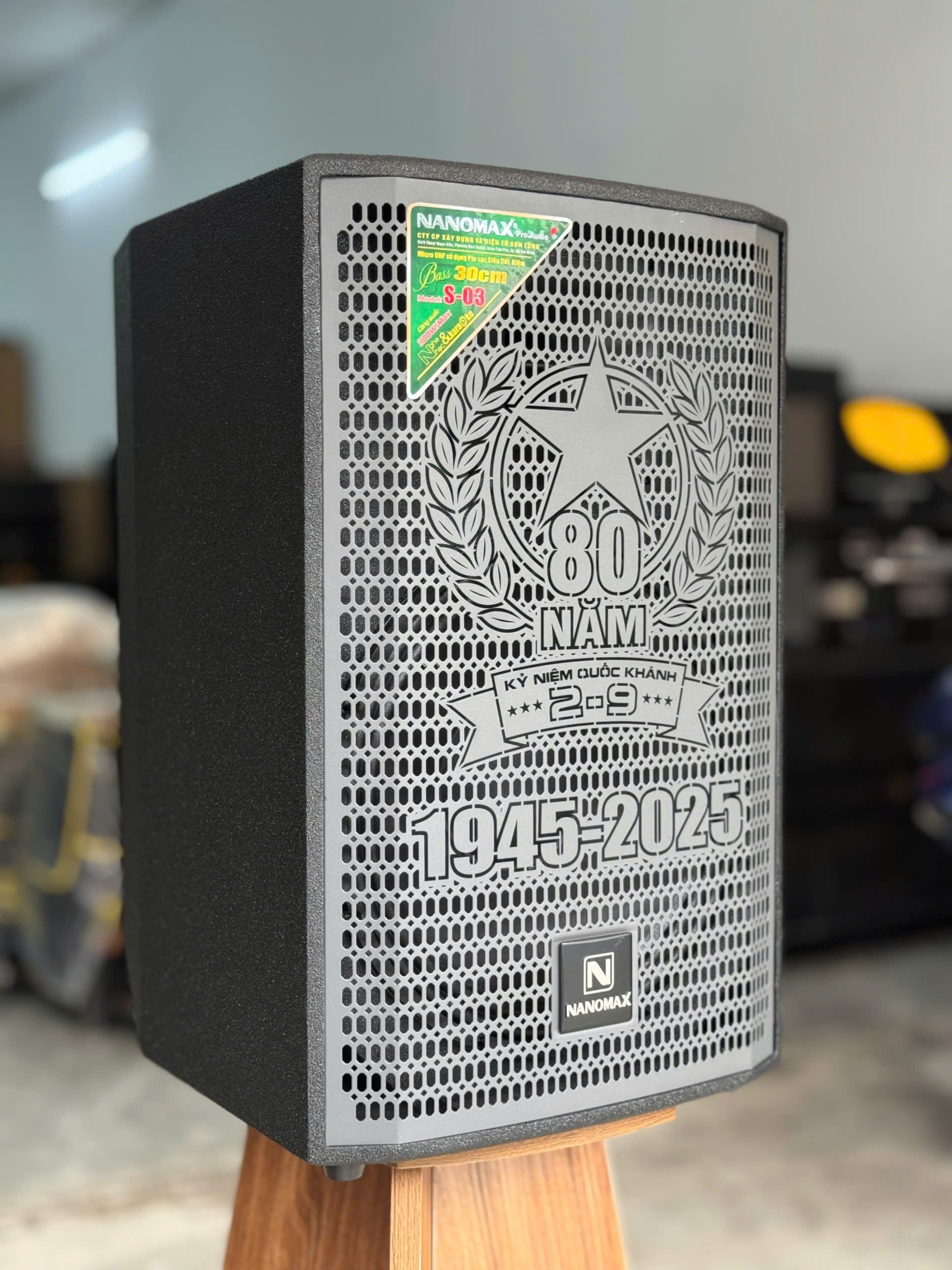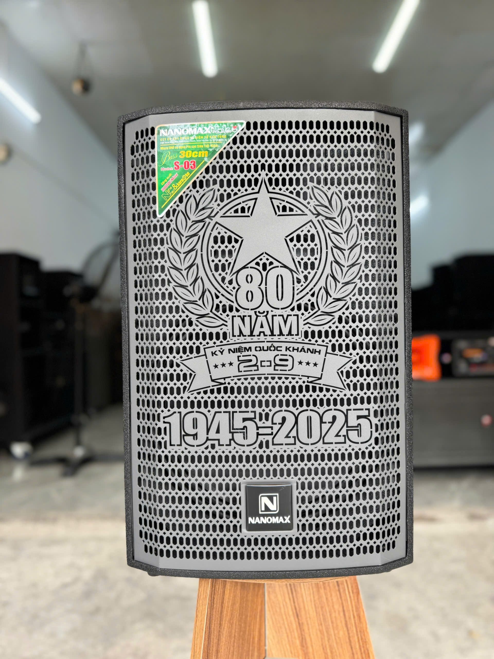 Điểm nổi bật nhất của loa xách tay công suất lớn Nanomax S03 phiên bản đặc biệt chính là mặt lưới được in biểu tượng kỷ niệm 80 năm Quốc Khánh 2-9. Hình ảnh trang trọng này không chỉ tôn vinh lịch sử hào hùng, mà còn tạo nên bản sắc riêng biệt, khẳng định rằng: mỗi âm thanh phát ra từ chiếc loa xách tay Nanomax đều là lời nhắc nhớ về một quá khứ oai hùng và tương lai rực rỡ.